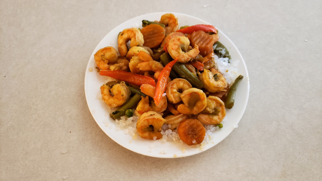 - Preheat oil in a large skillet over medium heat 3 to 5 minutes or until hot. Add the shrimp, vegetables and dry seasonings. Stir to fully combine. Allow to cook 5 minutes, stirring occasionally or until heated through and vegetables are tender. In a small bowl whisk together the remaining ingredients until fully combined and the gelatin powder is fully dissolved.