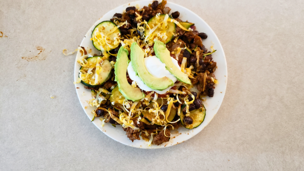 - Stir in the salsa, taco seasonings, beans, (if using), zucchini, salt and pepper. Stir frequently and cook for 5 minutes until the zucchini is crisp-tender. Turn the heat off. Sprinkle desired amount of shredded cheese over top of mixture. Allow to sit 2 minutes until the cheese is melted. Spoon desired amount onto a serving plate and top with toppings of choice.