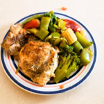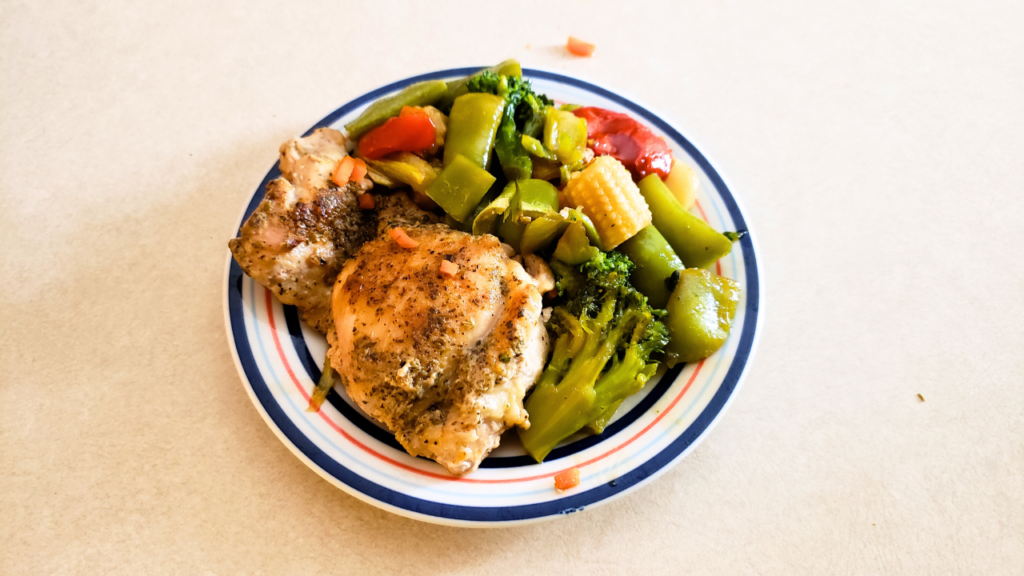 - Add the chicken thighs to the melted butter and oil. Allow to cook 5 minutes. Turn the chicken over and allow to cook another 5 minutes or until brown on both sides. Add the vegetables. Cover and cook for 4 minutes. Stir, return the cover and cook another 4 minutes or until chicken is fully cooked (at least 165 degrees)