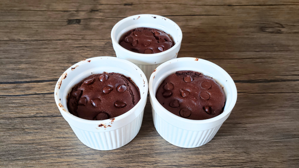 - If desired fold in keto chocolate chips or add-ins of choice. Divide the batter evenly throughout each ramekin or muffin cup. (About 6 TBS in of batter in the ramekins or 3 to 4 TBS in muffin cups) Use a butter knife and spread the batter evenly and smoothly throughout the ramekins/muffin cups.