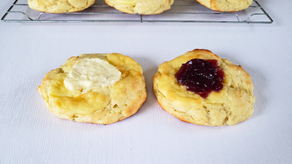 - After 15 minutes scoop the dough out 1/4 cup at a time onto the prepared baking sheet. Use a butter knife and shape each scoop into a circular mound. Spoon 1 TBS of the topping of choice into the center of each mound. Place the Danishes in the preheated oven.