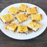 - Brush the beaten egg lightly and evenly over the top of the dough. If desired sprinkle with the desired amount of sesame seeds. Place in the preheated oven and bake at 375 degrees for 15 to 20 minutes or until the top is golden. Remove from the oven and cool in the pan at least 20 minutes to firm up.