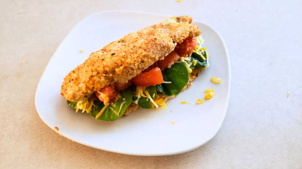 - Place the coated chicken around a taco shell mold or lay flat on a lined baking sheet. (like a tostada shell) If using the molds place the molds on a baking sheet. Spoon more of the crumb mixture over the bottom of the crumb plate and repeat the coating process until all chicken portions are coated and on the molds in the baking sheet.