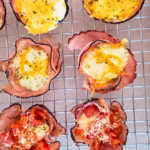- Preheat oven to 400 degrees. Lightly grease 6 muffin cups. Press one slice of jame into each prepared muffin cup. Crack one egg into 3 of the ham cups. Divide the cream cheese cubes between the remaining 3 ham cups. Top the cream cheese with the sweet peppers. Top all the hame cups with the desired amount of shredded cheese. Bake in the preheated oven for 10 to 15 minutes until the egg is fully cooked and the ham is crispy on the edges. Remove from the oven and cool in the pan 5 to 10 minutes until firm.
