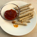 - place dough on a lined worksurface. Cover the dough with parchment aper. Roll the dough out to a rectangle that is about 1/4 inch thick. Use a pizza v=cutter and cut the dough into strips that are about 3 inches long. Place the "fries: in a single layer on the prepared oven fryer basket. Leave space between the fries.