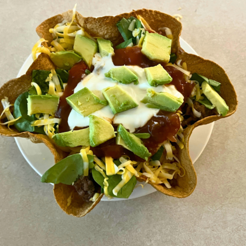 - Divide the desired amount of filling between the cooled tortilla bowls. Top with lettuce, shredded cheese, salsa, sour cream or toppings of choice. Serve warm