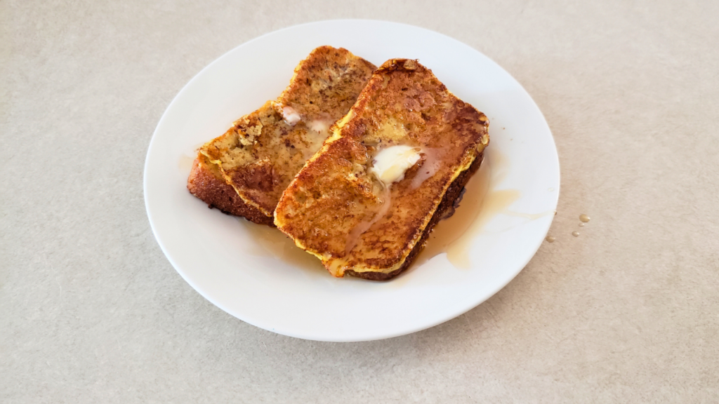 - Place desired one to two slices of French toast on a serving plate. Top the French toast with butter and keto syrup or toppings of choice. Serve warm.