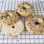 - Use finger and poke a hole completely through the center of the bagel. Make sure the hole is wide enough, so it does not close up while baking. If desired brush the tops of each bagel with egg wash and add the topping of choice. I used everything bagel seasoning. Place the bagels into the preheated oven.