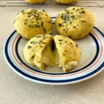 Pull the dough up and over the cheese. Roll the dough ball in hand to completely seal the cheese in. Make sure there are no cracks. Place the stuffed dough ball back onto the prepared baking sheet. Leave space between each filled dough ball. Use palm of hand and slightly flatten to tops of each dough ball. Make sure to leave space between each dough ball