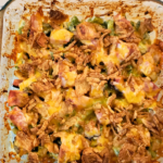 Remove from the oven. Top the casserole with the desired amount of shredded cheese of choice. Top the cheese with desired amount of crushed pork rinds. Place back into the preheated oven. Bake at 425 degrees for 10 minutes or until the cheese is fully melted and everything is heated through. Remove from the oven and allow to cool for 5 minutes before serving.